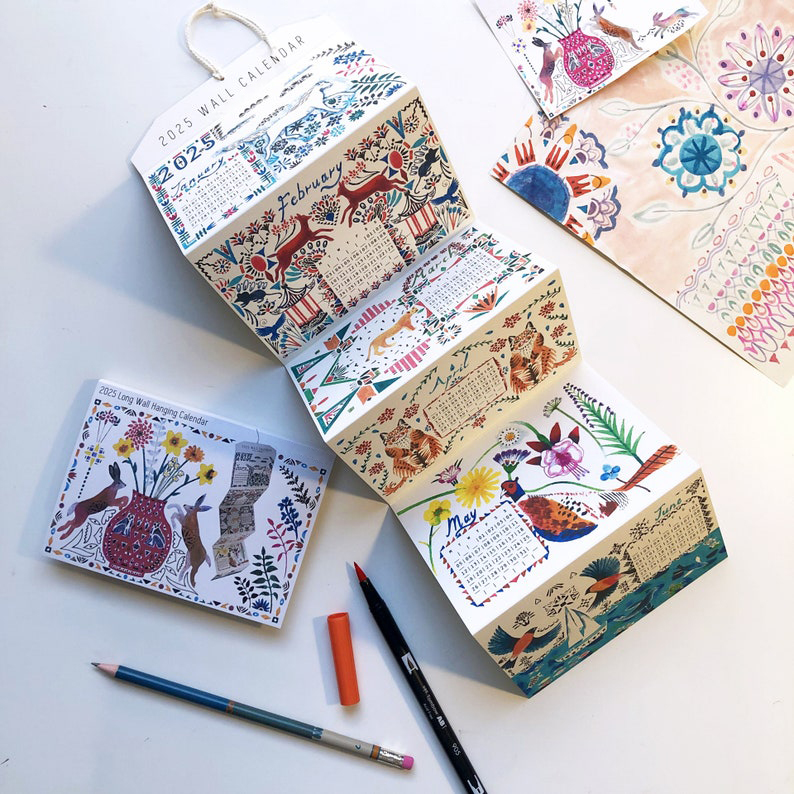 🦌This 2025 long wall hanging calendar is illustrated with twelve colourful animal illustrations, which includes a pheasant among wild flowers, deer leaping over a pagoda, hares dancing around a vase of flowers, a folk forest of bears and swans, and a sleepy dog at a picnic.