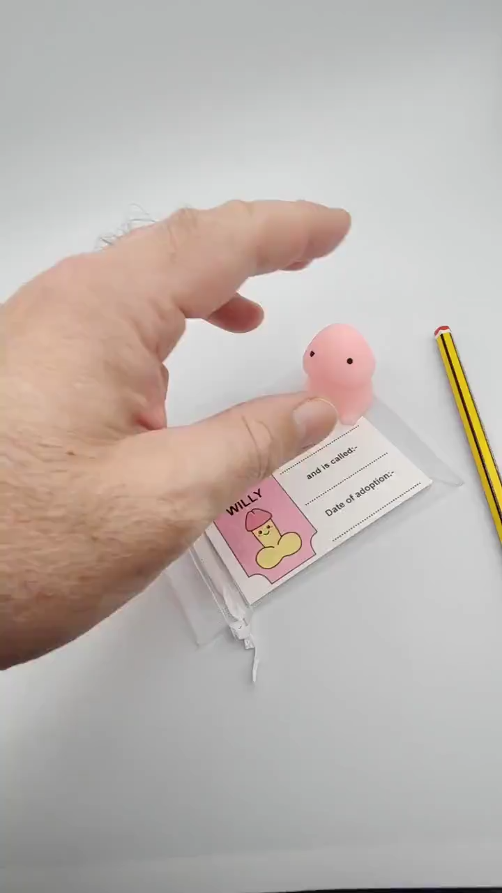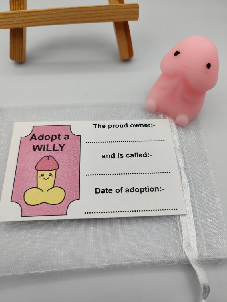 Fun squidgy stress relief little Willy with adoption card to prank your friends.