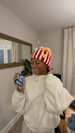 This hat boasts a playful, slouchy silhouette that sits comfortably on any head size. It features bold red-and-white vertical stripes and plus 3D fluffy off-'popcorn ' scattered across the surface🍿. It’s not just a hat—it’s a walking mood booster that turns heads wherever you go!