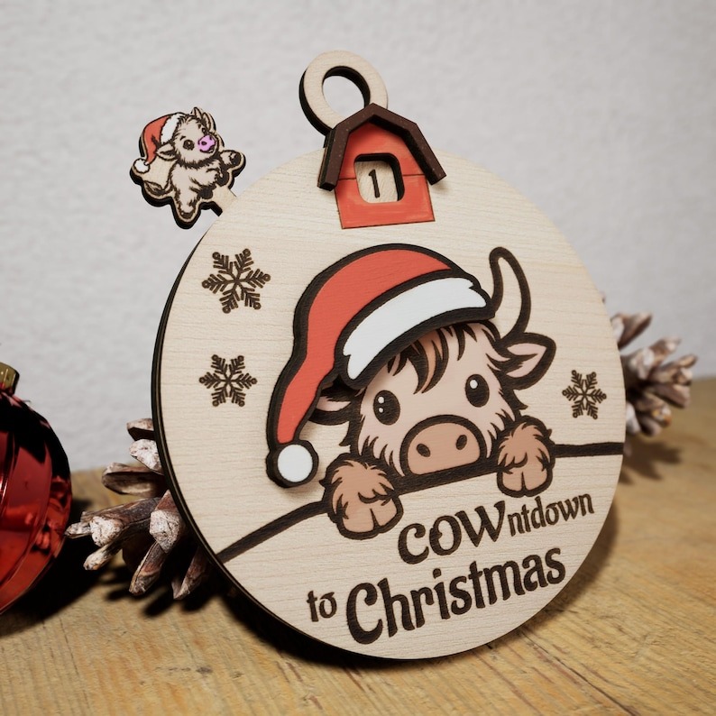🌈Get ready to moo-ve into the holiday spirit with this adorable Days Until Christmas Countdown Calendar! Perfect for bringing a touch of cuteness to your home, this wooden ornament-style calendar features an irresistibly charming cow, decked out in a festive Santa hat, counting down the days to Christmas with you.