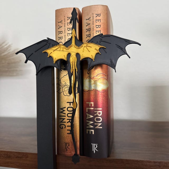 Our book insert is designed to resemble a majestic black and gold dragon, inspired by the beloved book series Fourth Wing. This delightful piece not only holds your books in place but also serves as a whimsical decoration for your bookshelf.