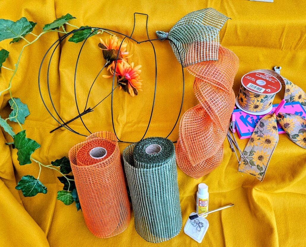 The body of the pumpkin is constructed with poly burlap mesh in orange. The pumpkin stem is olive green poly burlap mesh. Berry accents and a lovely bow adorned with pumpkins complete the look.