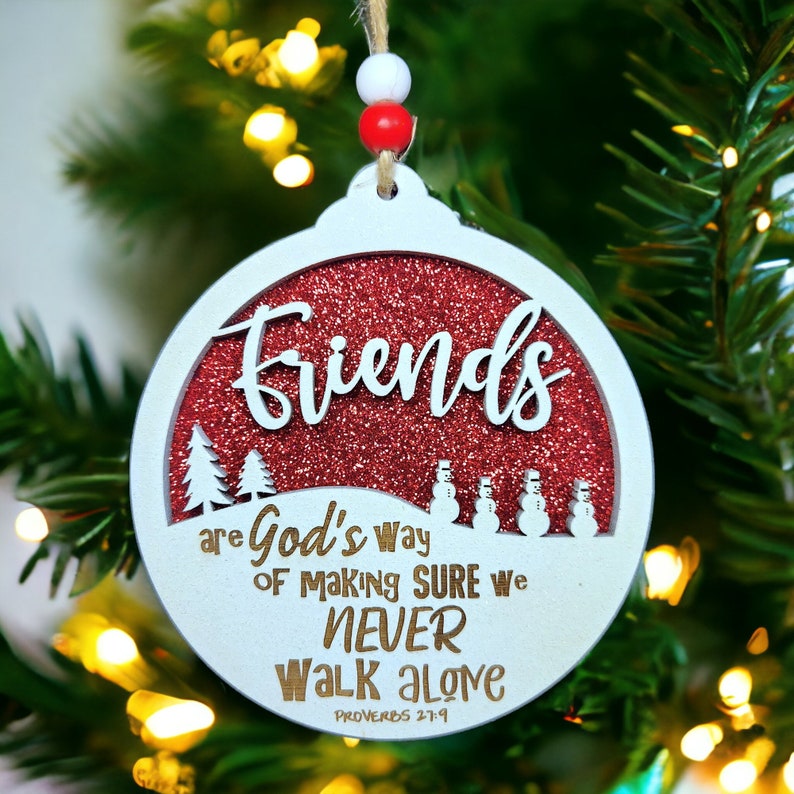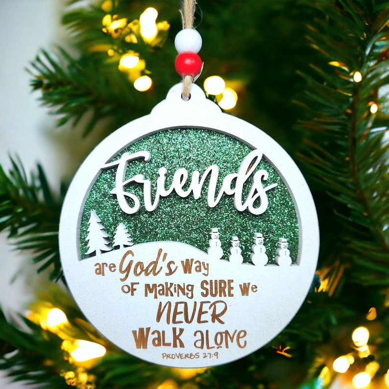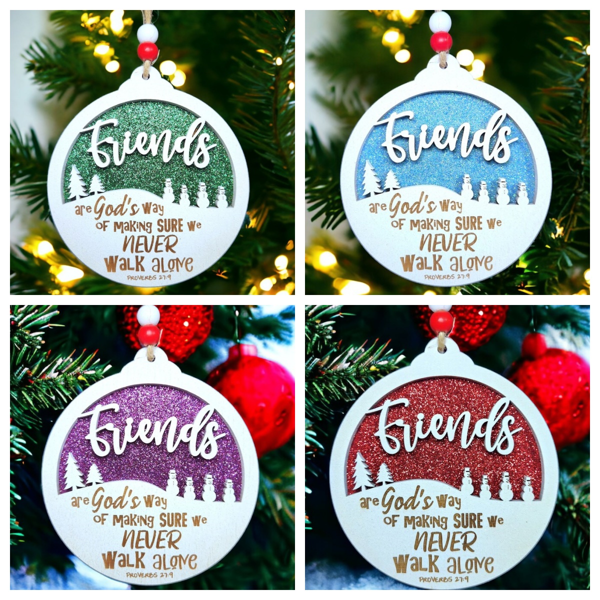 ✨This ornament features the word "Friends" on the top, surrounded by snowmen and trees, and bears the touching inscription "are God's way of making sure we never walk alone Proverbs 29:9."