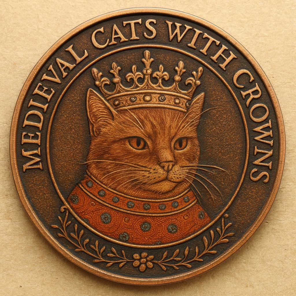 Bold “MEDIEVAL CATS WITH CROWNS” inscription encircling the royal feline