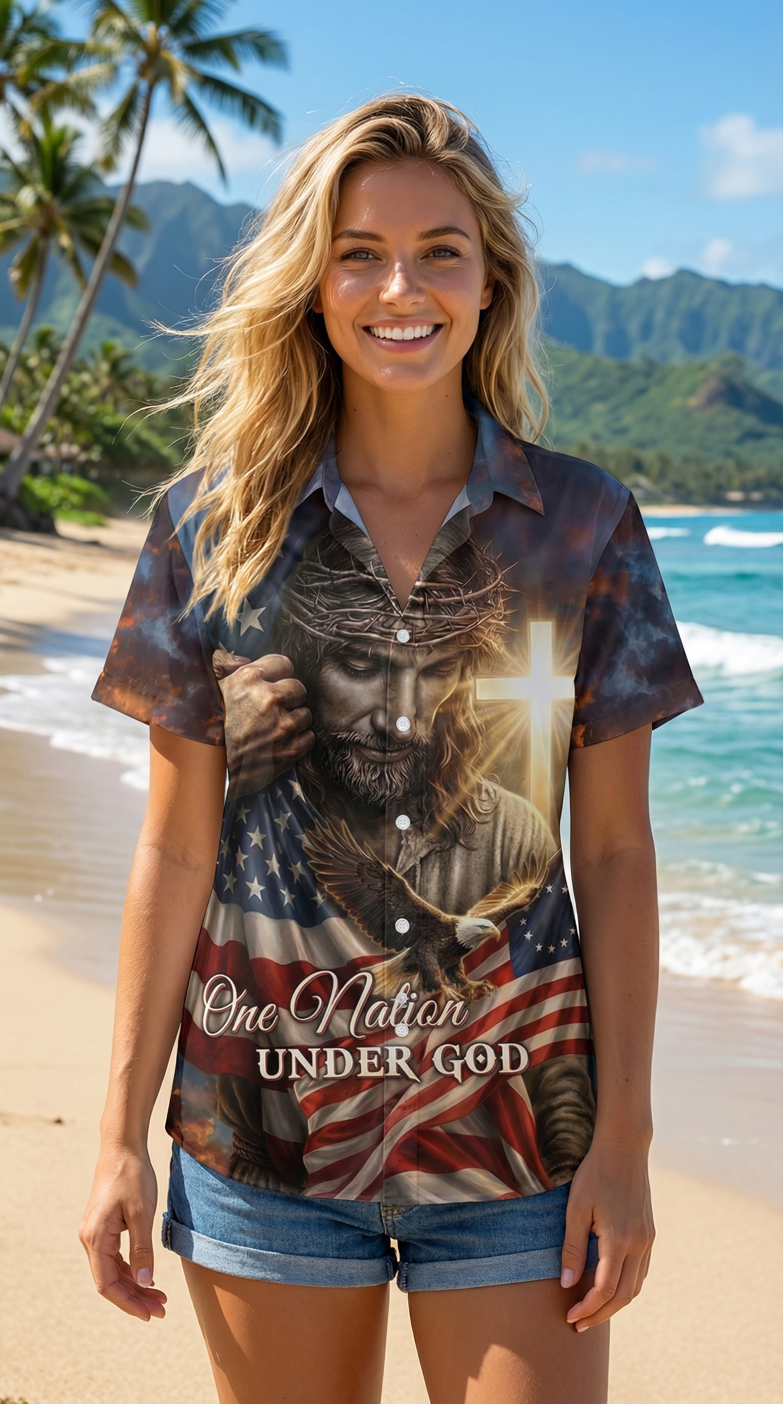 The "One Country Under God" Hawaiian Shirt: This relaxed-fit shirt perfectly blends your love for the beach with your patriotism. Its design embodies a strong sense of national identity, subtly conveying the message of "One Country Under God," a constant reminder of the values that unite us.